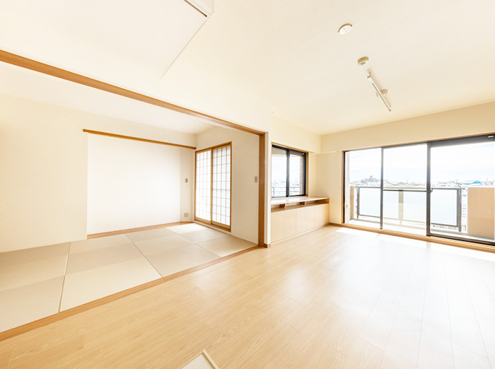 お子様が成長していく将来を見据え、購入した中古マンションをご入居までにリノベーションする計画としてご依頼をいただきました。和室とリビング空間をバリアフリーにし、キッチンの一部の壁を取り壊し、水まわり(トイレ以外)やキッチンをリフォームされました。築23年を経過したマンションをお客様の心のこもったアイデアを参考に、シンプルな空間が実現し ました。